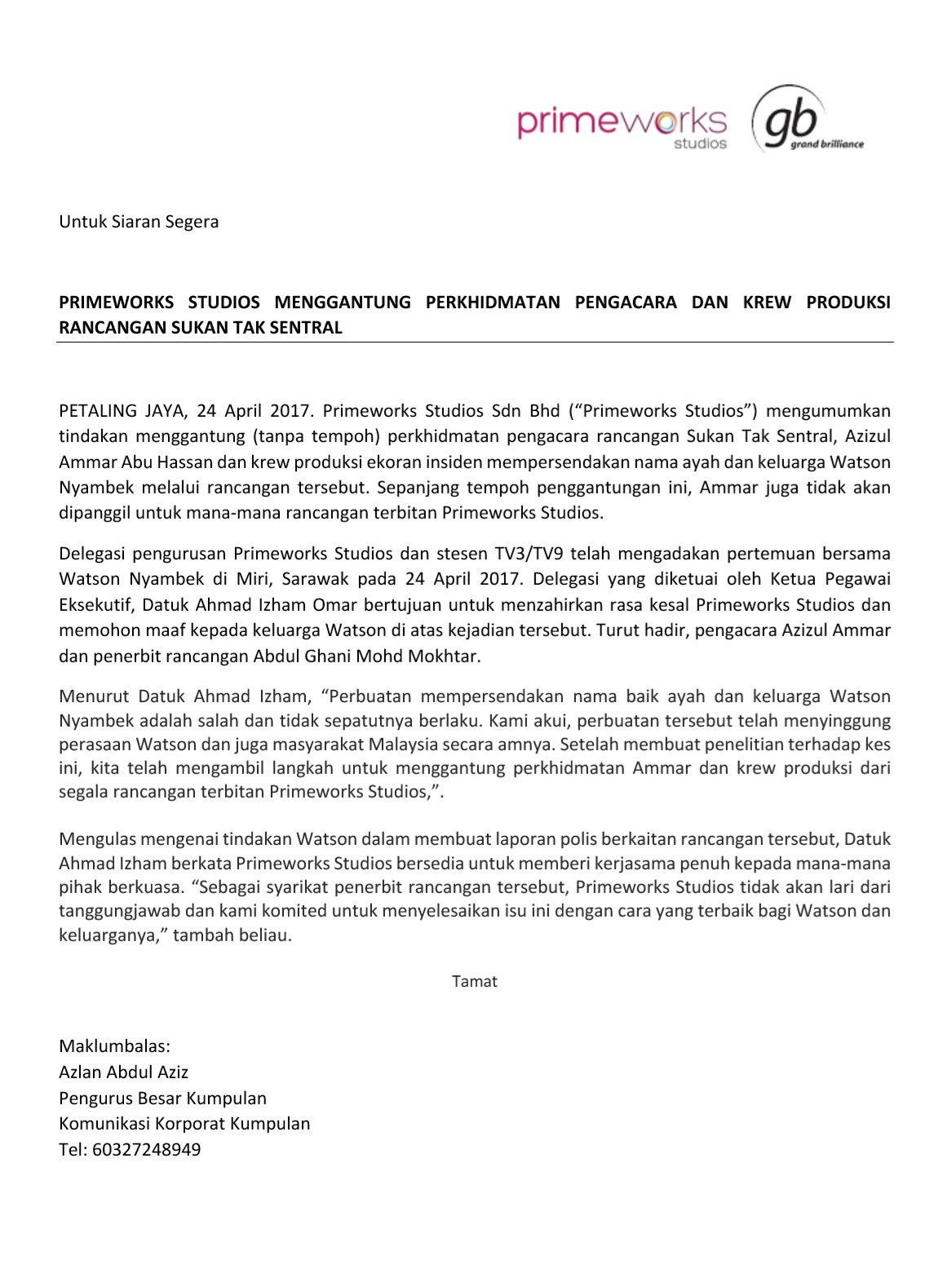 Primeworks studios gantung pengacara krew rancangan sukan tak sentral papar berkaitan pada 25 4 2017 jumlah. Miri primeworks studios sdn bhd menggantung khidmat pengacara azizul ammar abu hassan dan enam kru penerbitan tanpa tempoh dinyatakan berkuat kuasa serta merta susulan isu mempersendakan nama ayah bekas pelari pecut negara watson nyambek. Imej imej pengacara penerbit sukan tak sentral bebas tuduhan hina.