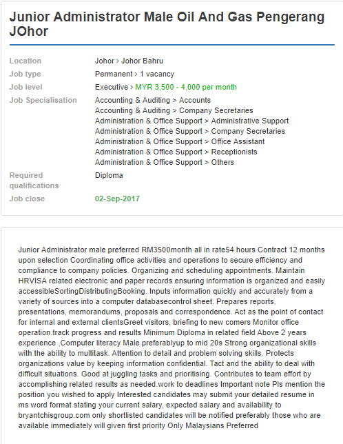 Oil Gas Vacancies Junior Administrator Male Oil And Gas Pengerang