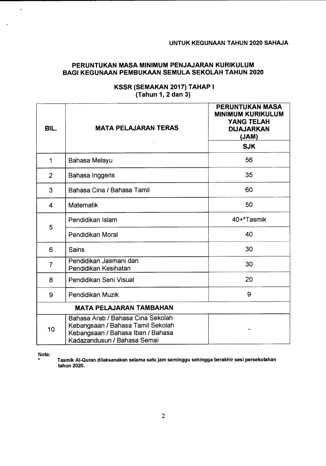 Peruntukan Masa Minimum Penjajaran Kssr 2020 Baru Pendidik2u