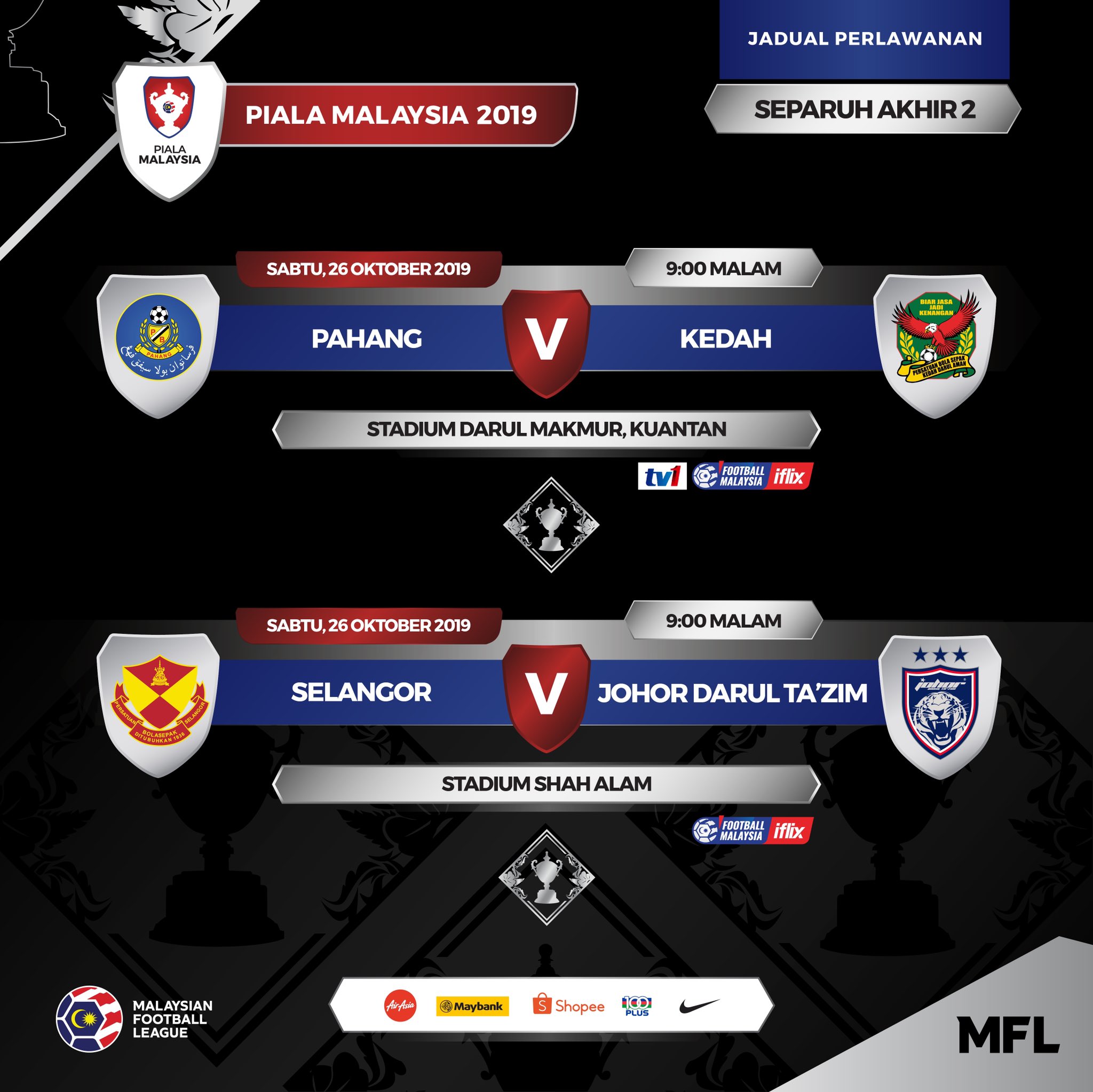 Perlawanan ini dijangka akan berlangsung pada hari sabtu 19 september 2020 jam 9 00 malam di stadium sultan ibrahim. Live updates tv channel live streaming squad news and msl table. Saksikan perlawanan menarik antara juara liga super 2019 johor darul ta zim menentang selangor fa dalam aksi separuh akhir kedua piala malaysia 2019.